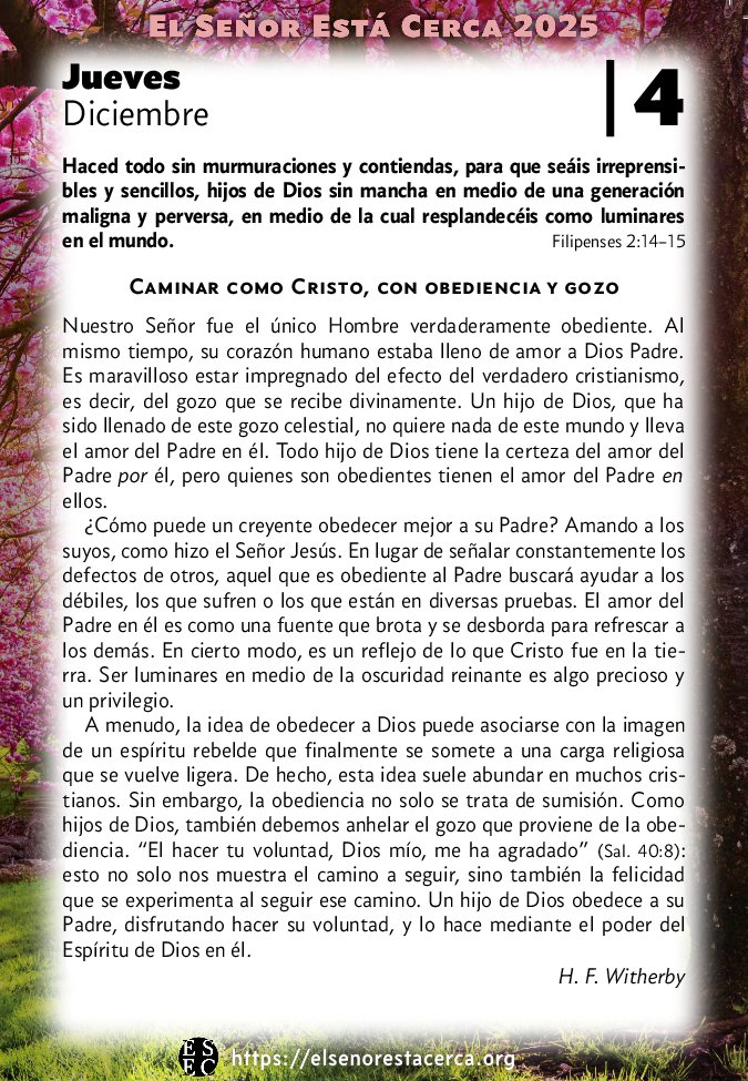 A menudo, la idea de obedecer a Dios puede asociarse con la imagen de un espíritu rebelde que finalmente se somete a una carga religiosa que se vuelve ligera. De hecho, esta idea suele abundar en muchos cristianos. Sin embargo, la obediencia no solo se trata de sumisión. Como hijos de Dios, también debemos anhelar el gozo que proviene de la obediencia. “El hacer tu voluntad, Dios mío, me ha agradado” (Sal. 40:8): esto no solo nos muestra el camino a seguir, sino también la felicidad que se experimenta al seguir ese camino. Un hijo de Dios obedece a su Padre, disfrutando hacer su voluntad, y lo hace mediante el poder del Espíritu de Dios en él.