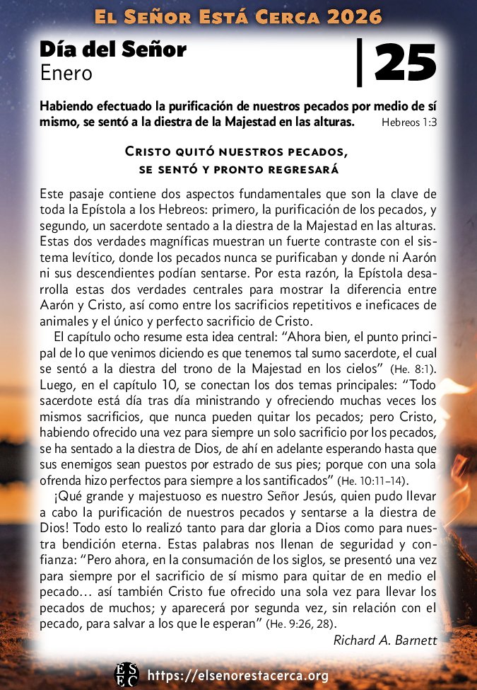 ¡Qué grande y majestuoso es nuestro Señor Jesús, quien pudo llevar a cabo la purificación de nuestros pecados y sentarse a la diestra de Dios! Todo esto lo realizó tanto para dar gloria a Dios como para nuestra bendición eterna. Estas palabras nos llenan de seguridad y confianza: “Pero ahora, en la consumación de los siglos, se presentó una vez para siempre por el sacrificio de sí mismo para quitar de en medio el pecado… así también Cristo fue ofrecido una sola vez para llevar los pecados de muchos; y aparecerá por segunda vez, sin relación con el pecado, para salvar a los que le esperan” (He. 9:26, 28).