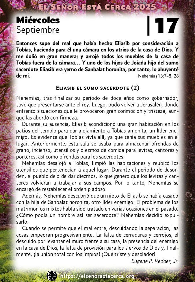 Entonces supe del mal que había hecho Eliasib por consideración a Tobías, haciendo para él una cámara en los atrios de la casa de Dios. Y me dolió en gran manera; y arrojé todos los muebles de la casa de Tobías fuera de la cámara… Y uno de los hijos de Joiada hijo del sumo sacerdote Eliasib era yerno de Sanbalat horonita; por tanto, lo ahuyenté de mí. Nehemías 13:7–8, 28