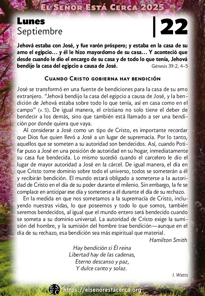 Al considerar a José como un tipo de Cristo, es importante recordar que Dios fue quien llevó a José a un lugar de supremacía. Por lo tanto, aquellos que se someten a su autoridad son bendecidos. Así, cuando Potifar puso a José en una posición de autoridad en su hogar, inmediatamente su casa fue bendecida. Lo mismo sucedió cuando el carcelero le dio el lugar de mayor autoridad a José en la cárcel. De igual manera, el día en que Cristo tome dominio sobre todo el universo, todos se someterán a él y recibirán bendición. El mundo estará obligado a someterse a la autoridad de Cristo en el día de su poder durante el milenio. Sin embargo, la fe se complace en anticipar ese día y someterse a él durante el día de su rechazo.