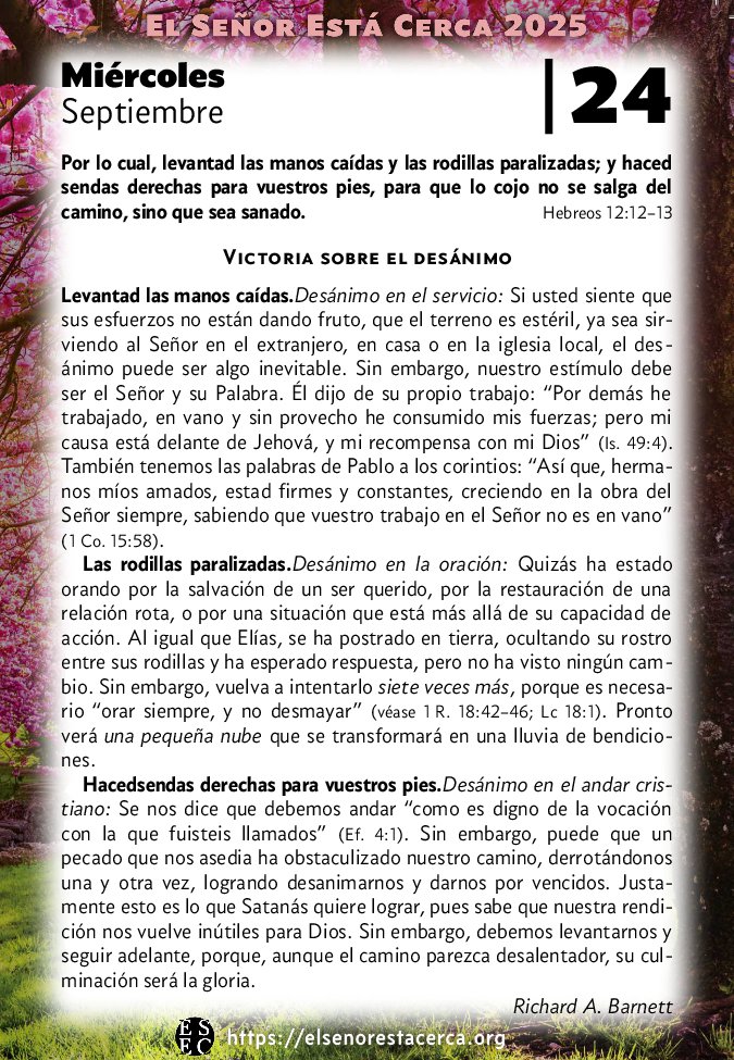 Levantad las manos caídas.Desánimo en el servicio: Si usted siente que sus esfuerzos no están dando fruto, que el terreno es estéril, ya sea sirviendo al Señor en el extranjero, en casa o en la iglesia local, el desánimo puede ser algo inevitable. Sin embargo, nuestro estímulo debe ser el Señor y su Palabra. Él dijo de su propio trabajo: “Por demás he trabajado, en vano y sin provecho he consumido mis fuerzas; pero mi causa está delante de Jehová, y mi recompensa con mi Dios” (Is. 49:4). También tenemos las palabras de Pablo a los corintios: “Así que, hermanos míos amados, estad firmes y constantes, creciendo en la obra del Señor siempre, sabiendo que vuestro trabajo en el Señor no es en vano” (1 Co. 15:58).