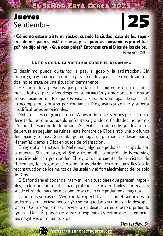 ¿Cómo es su caso? ¿Vive con la expectativa de que el Señor obrará poderosa y misteriosamente? ¿O se ha quedado sumido en la desesperación? Como Nehemías, convierta su desilusión en oración, pidiendo ayuda a Dios. Él puede restaurar su esperanza y evitar que las emociones negativas dominen su vida.