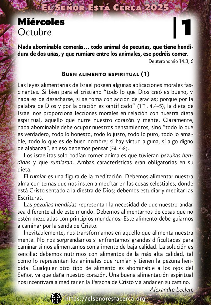 Inevitablemente, nos transformamos en aquello que alimenta nuestra mente. No nos sorprendamos si enfrentamos grandes dificultades para caminar si nos alimentamos con alimento de baja calidad. La solución es sencilla: debemos nutrirnos con alimentos de la más alta calidad, tal como lo representan los animales que rumian y tienen la pezuña hendida. Cualquier otro tipo de alimento es abominable a los ojos del Señor, ya que daña nuestro corazón. Una buena alimentación espiritual nos incentivará a meditar en la Persona de Cristo y a andar en su camino.