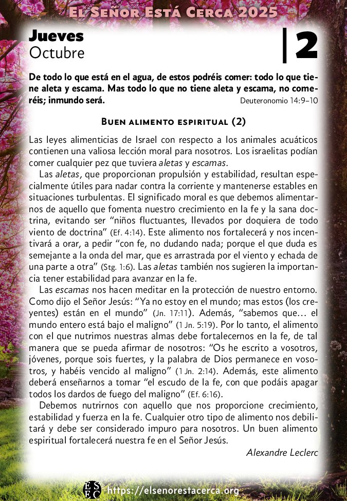 Debemos nutrirnos con aquello que nos proporcione crecimiento, estabilidad y fuerza en la fe. Cualquier otro tipo de alimento nos debilitará y debe ser considerado impuro para nosotros. Un buen alimento espiritual fortalecerá nuestra fe en el Señor Jesús.
