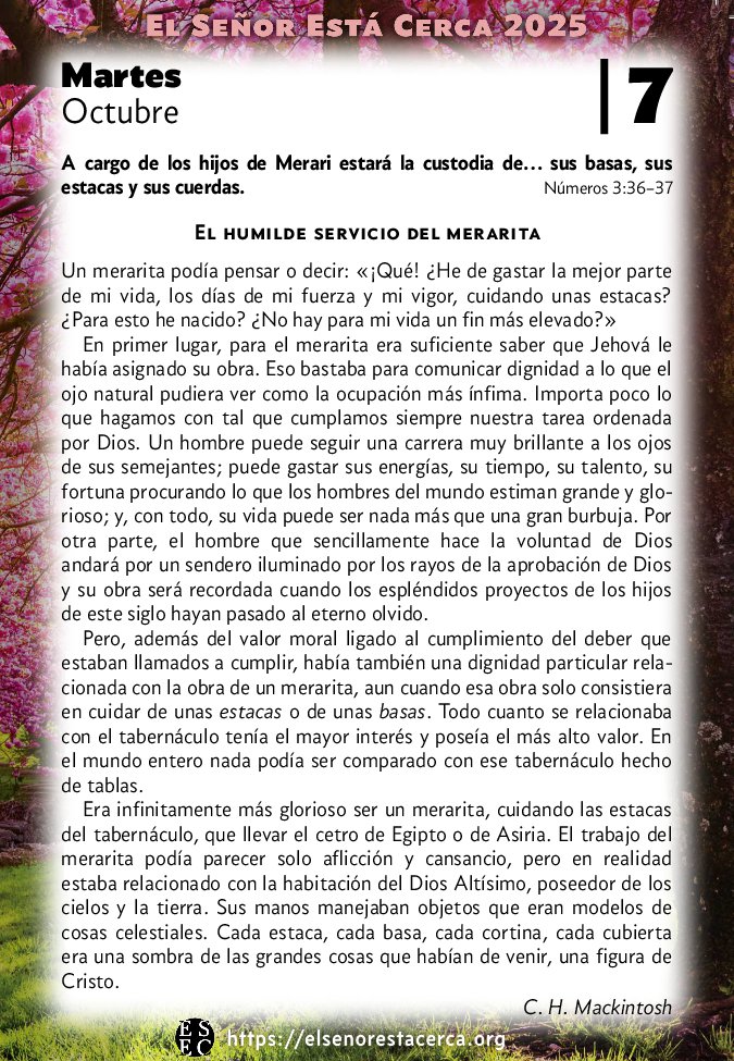 Era infinitamente más glorioso ser un merarita, cuidando las estacas del tabernáculo, que llevar el cetro de Egipto o de Asiria. El trabajo del merarita podía parecer solo aflicción y cansancio, pero en realidad estaba relacionado con la habitación del Dios Altísimo, poseedor de los cielos y la tierra. Sus manos manejaban objetos que eran modelos de cosas celestiales. Cada estaca, cada basa, cada cortina, cada cubierta era una sombra de las grandes cosas que habían de venir, una figura de Cristo.