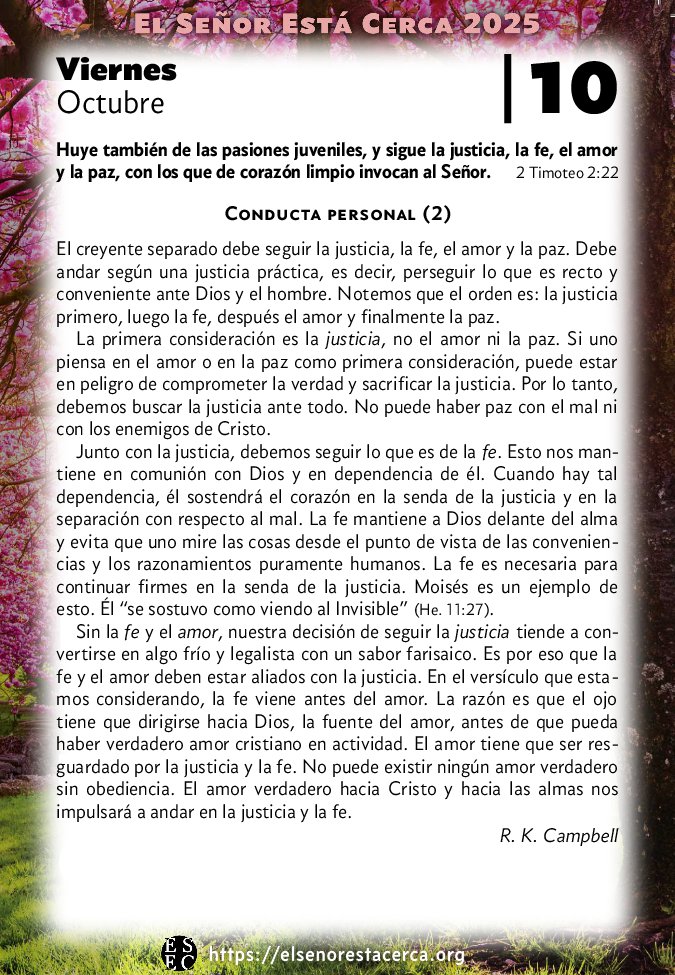 El creyente separado debe seguir la justicia, la fe, el amor y la paz. Debe andar según una justicia práctica, es decir, perseguir lo que es recto y conveniente ante Dios y el hombre. Notemos que el orden es: la justicia primero, luego la fe, después el amor y finalmente la paz.