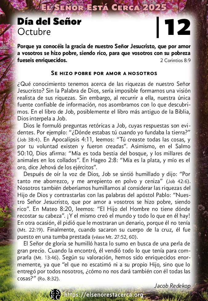Porque ya conocéis la gracia de nuestro Señor Jesucristo, que por amor a vosotros se hizo pobre, siendo rico, para que vosotros con su pobreza fueseis enriquecidos. 2 Corintios 8:9