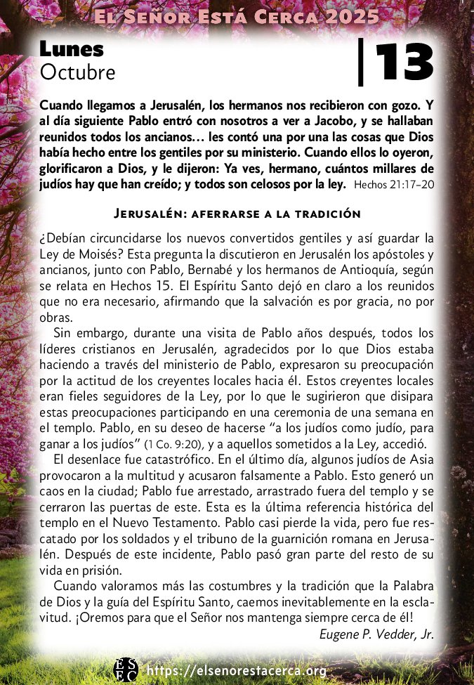 Sin embargo, durante una visita de Pablo años después, todos los líderes cristianos en Jerusalén, agradecidos por lo que Dios estaba haciendo a través del ministerio de Pablo, expresaron su preocupación por la actitud de los creyentes locales hacia él. Estos creyentes locales eran fieles seguidores de la Ley, por lo que le sugirieron que disipara estas preocupaciones participando en una ceremonia de una semana en el templo. Pablo, en su deseo de hacerse “a los judíos como judío, para ganar a los judíos” (1 Co. 9:20), y a aquellos sometidos a la Ley, accedió.