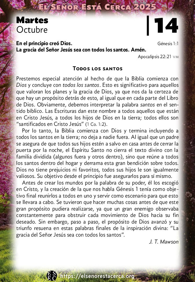Prestemos especial atención al hecho de que la Biblia comienza con Dios y concluye con todos los santos. Esto es significativo para aquellos que valoran los planes y la gracia de Dios, ya que nos da la certeza de que hay un propósito detrás de esto, al igual que en cada parte del Libro de Dios. Obviamente, debemos interpretar la palabra santos en el sentido bíblico. Las Escrituras dan este nombre a todos aquellos que están en Cristo Jesús, a todos los hijos de Dios en la tierra; todos ellos son “santificados en Cristo Jesús” (1 Co. 1:2).