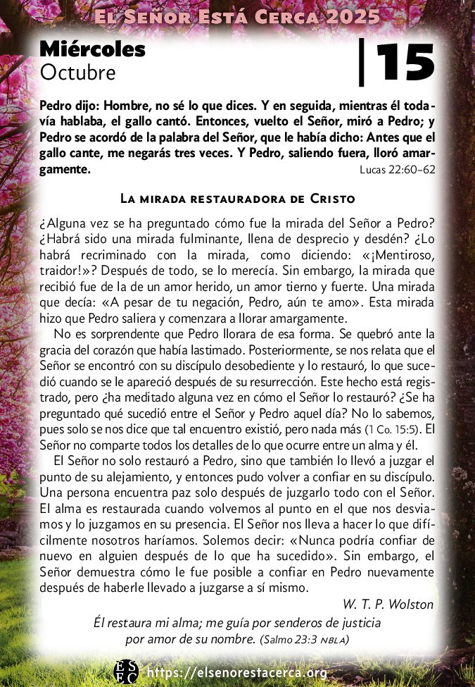 ¿Alguna vez se ha preguntado cómo fue la mirada del Señor a Pedro? ¿Habrá sido una mirada fulminante, llena de desprecio y desdén? ¿Lo habrá recriminado con la mirada, como diciendo: «¡Mentiroso, traidor!»? Después de todo, se lo merecía. Sin embargo, la mirada que recibió fue de la de un amor herido, un amor tierno y fuerte. Una mirada que decía: «A pesar de tu negación, Pedro, aún te amo». Esta mirada hizo que Pedro saliera y comenzara a llorar amargamente.