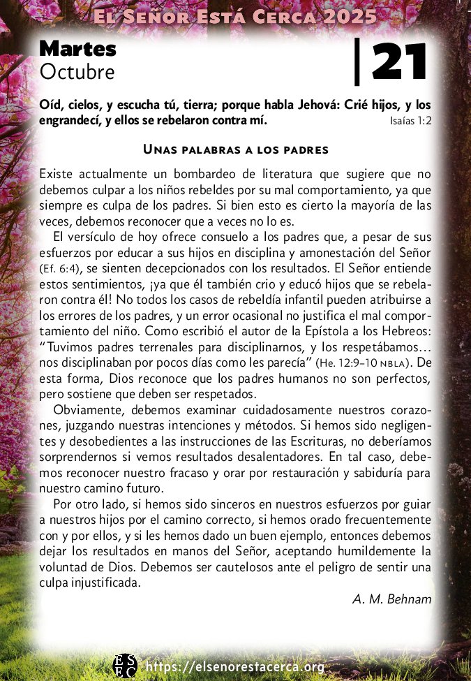 El versículo de hoy ofrece consuelo a los padres que, a pesar de sus esfuerzos por educar a sus hijos en disciplina y amonestación del Señor (Ef. 6:4), se sienten decepcionados con los resultados. El Señor entiende estos sentimientos, ¡ya que él también crio y educó hijos que se rebelaron contra él! No todos los casos de rebeldía infantil pueden atribuirse a los errores de los padres, y un error ocasional no justifica el mal comportamiento del niño. Como escribió el autor de la Epístola a los Hebreos: “Tuvimos padres terrenales para disciplinarnos, y los respetábamos… nos disciplinaban por pocos días como les parecía” (He. 12:9–10 NBLA). De esta forma, Dios reconoce que los padres humanos no son perfectos, pero sostiene que deben ser respetados.