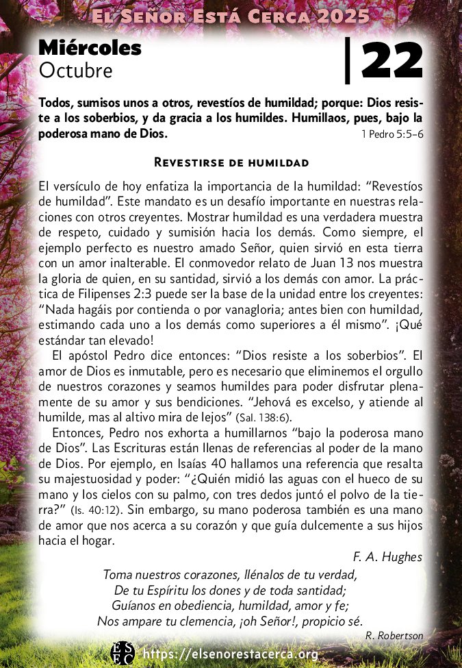 El versículo de hoy enfatiza la importancia de la humildad: “Revestíos de humildad”. Este mandato es un desafío importante en nuestras relaciones con otros creyentes. Mostrar humildad es una verdadera muestra de respeto, cuidado y sumisión hacia los demás. Como siempre, el ejemplo perfecto es nuestro amado Señor, quien sirvió en esta tierra con un amor inalterable. El conmovedor relato de Juan 13 nos muestra la gloria de quien, en su santidad, sirvió a los demás con amor. La práctica de Filipenses 2:3 puede ser la base de la unidad entre los creyentes: “Nada hagáis por contienda o por vanagloria; antes bien con humildad, estimando cada uno a los demás como superiores a él mismo”. ¡Qué estándar tan elevado!