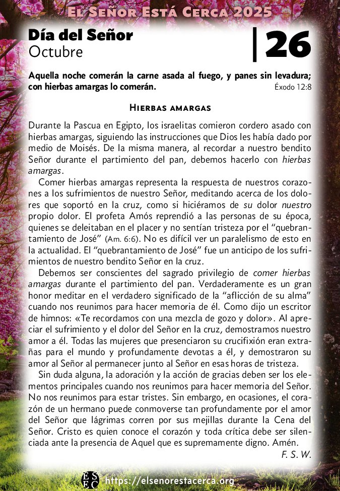 Debemos ser conscientes del sagrado privilegio de comer hierbas amargas durante el partimiento del pan. Verdaderamente es un gran honor meditar en el verdadero significado de la “aflicción de su alma” cuando nos reunimos para hacer memoria de él. Como dijo un escritor de himnos: «Te recordamos con una mezcla de gozo y dolor». Al apreciar el sufrimiento y el dolor del Señor en la cruz, demostramos nuestro amor a él. Todas las mujeres que presenciaron su crucifixión eran extrañas para el mundo y profundamente devotas a él, y demostraron su amor al Señor al permanecer junto al Señor en esas horas de tristeza.