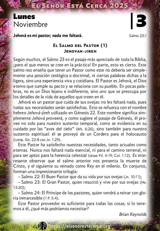 Jehová es un pastor que cuida de sus ovejas: no les faltará nada, pues todas sus necesidades serán satisfechas. Esto se refuerza con el nombre hebreo Jehová-jireh utilizado en Génesis 22. Este nombre significa simplemente Jehová proveerá, y como sugiere el pasaje de Génesis, él provee no solo para nuestro sustento temporal, como se evidencia en su cuidado por las “aves del cielo” (Mt. 6:26), sino también para nuestro sustento espiritual: él se proveyó de un Cordero para el holocausto (comp. Gn. 22:8 con Jn. 1:29).