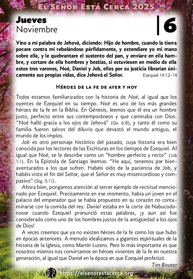 A veces creemos que ya no existen héroes de la fe como los que hubo en épocas anteriores. A menudo idealizamos a gigantes espirituales de la historia de la Iglesia, como Martín Lutero. Pero lo más importante es que nosotros mismos nos convirtamos en héroes vivientes de la fe en nuestra generación, al igual que Daniel en la época en que Ezequiel profetizó.