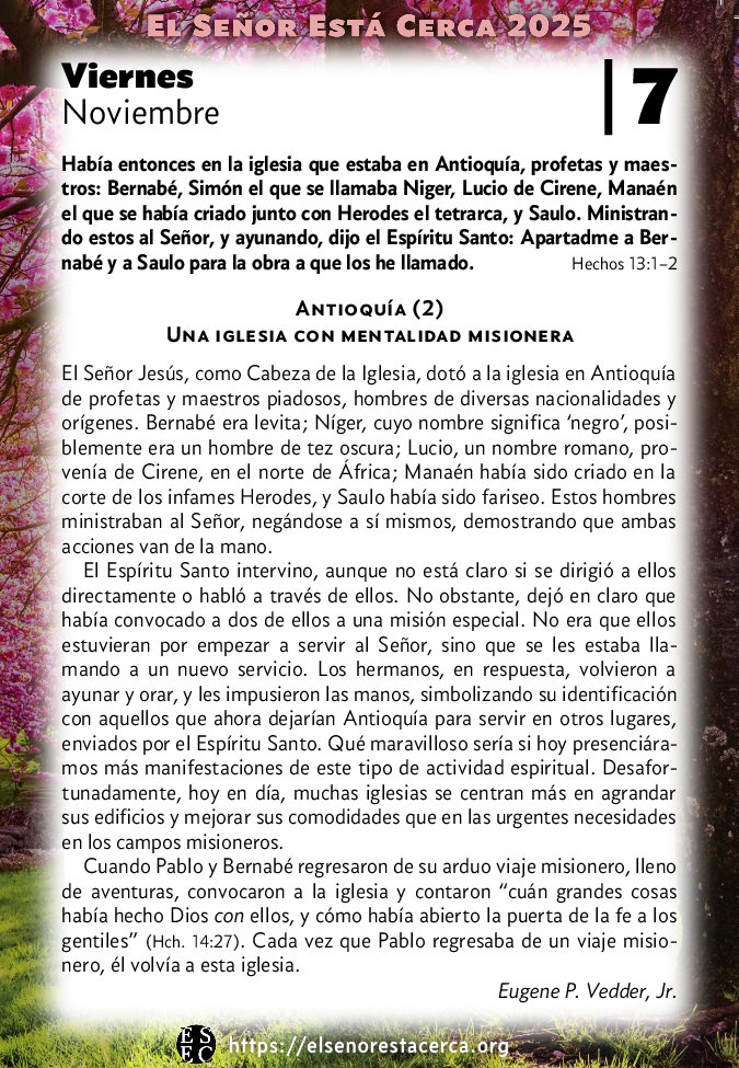 Había entonces en la iglesia que estaba en Antioquía, profetas y maestros: Bernabé, Simón el que se llamaba Niger, Lucio de Cirene, Manaén el que se había criado junto con Herodes el tetrarca, y Saulo. Ministrando estos al Señor, y ayunando, dijo el Espíritu Santo: Apartadme a Bernabé y a Saulo para la obra a que los he llamado. Hechos 13:1–2
