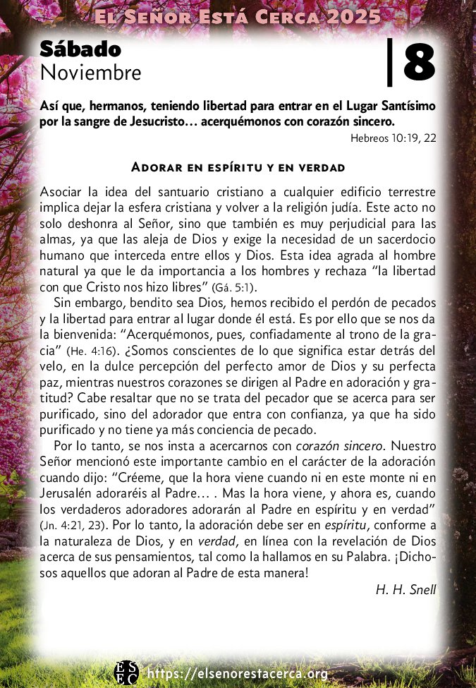 Por lo tanto, se nos insta a acercarnos con corazón sincero. Nuestro Señor mencionó este importante cambio en el carácter de la adoración cuando dijo: “Créeme, que la hora viene cuando ni en este monte ni en Jerusalén adoraréis al Padre… . Mas la hora viene, y ahora es, cuando los verdaderos adoradores adorarán al Padre en espíritu y en verdad” (Jn. 4:21, 23). Por lo tanto, la adoración debe ser en espíritu, conforme a la naturaleza de Dios, y en verdad, en línea con la revelación de Dios acerca de sus pensamientos, tal como la hallamos en su Palabra. ¡Dichosos aquellos que adoran al Padre de esta manera!