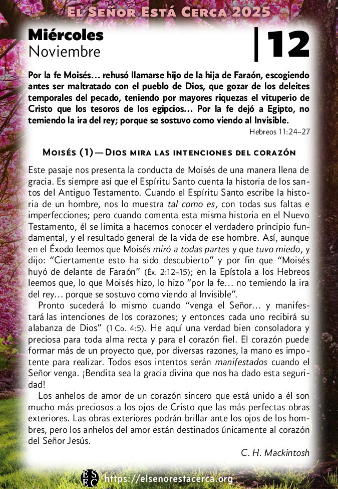 Pronto sucederá lo mismo cuando “venga el Señor… y manifestará las intenciones de los corazones; y entonces cada uno recibirá su alabanza de Dios” (1 Co. 4:5). He aquí una verdad bien consoladora y preciosa para toda alma recta y para el corazón fiel. El corazón puede formar más de un proyecto que, por diversas razones, la mano es impotente para realizar. Todos esos intentos serán manifestados cuando el Señor venga. ¡Bendita sea la gracia divina que nos ha dado esta seguridad!
