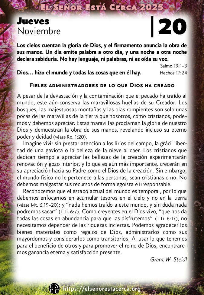 A pesar de la devastación y la contaminación que el pecado ha traído al mundo, este aún conserva las maravillosas huellas de su Creador. Los bosques, las majestuosas montañas y las olas rompientes son solo unas pocas de las maravillas de la tierra que nosotros, como cristianos, podemos y debemos apreciar. Estas maravillas proclaman la gloria de nuestro Dios y demuestran la obra de sus manos, revelando incluso su eterno poder y deidad (véase Ro. 1:20).