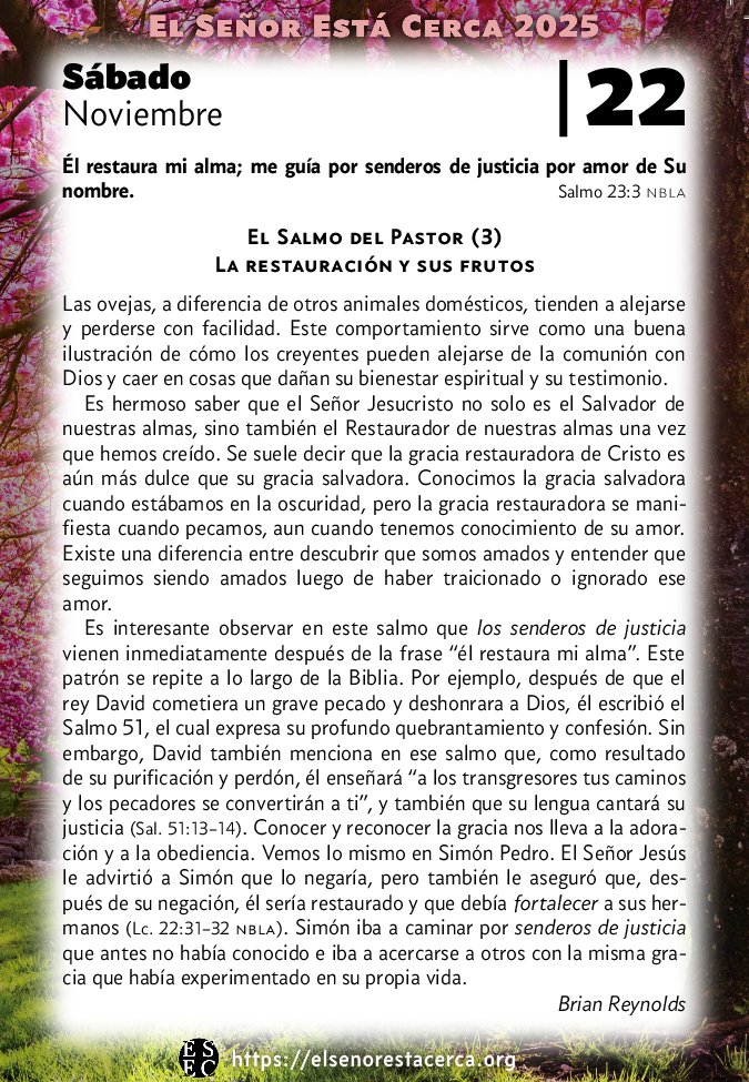 Es interesante observar en este salmo que los senderos de justicia vienen inmediatamente después de la frase “él restaura mi alma”. Este patrón se repite a lo largo de la Biblia. Por ejemplo, después de que el rey David cometiera un grave pecado y deshonrara a Dios, él escribió el Salmo 51, el cual expresa su profundo quebrantamiento y confesión. Sin embargo, David también menciona en ese salmo que, como resultado de su purificación y perdón, él enseñará “a los transgresores tus caminos y los pecadores se convertirán a ti”, y también que su lengua cantará su justicia (Sal. 51:13–14). Conocer y reconocer la gracia nos lleva a la adoración y a la obediencia. Vemos lo mismo en Simón Pedro. El Señor Jesús le advirtió a Simón que lo negaría, pero también le aseguró que, después de su negación, él sería restaurado y que debía fortalecer a sus hermanos (Lc. 22:31–32 NBLA). Simón iba a caminar por senderos de justicia que antes no había conocido e iba a acercarse a otros con la misma gracia que había experimentado en su propia vida.