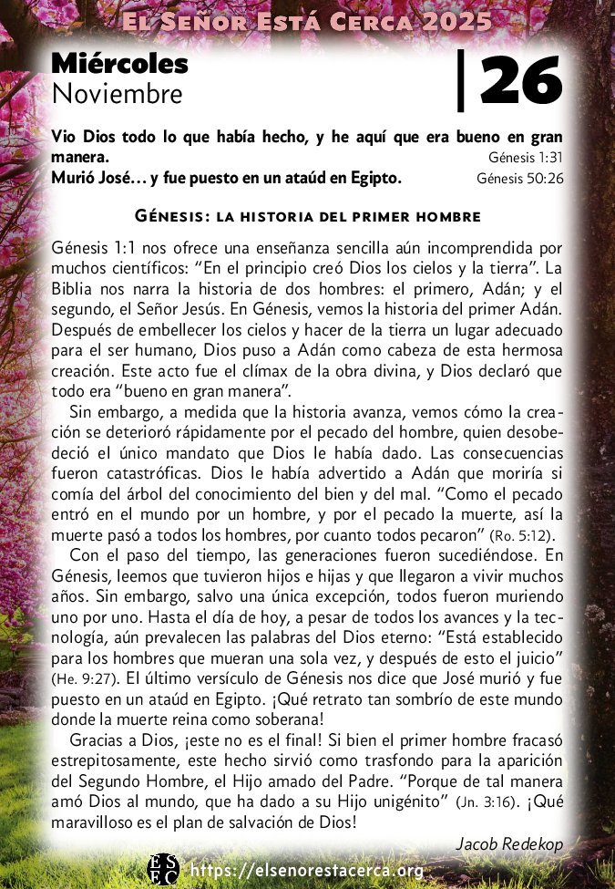 Génesis 1:1 nos ofrece una enseñanza sencilla aún incomprendida por muchos científicos: “En el principio creó Dios los cielos y la tierra”. La Biblia nos narra la historia de dos hombres: el primero, Adán; y el segundo, el Señor Jesús. En Génesis, vemos la historia del primer Adán. Después de embellecer los cielos y hacer de la tierra un lugar adecuado para el ser humano, Dios puso a Adán como cabeza de esta hermosa creación. Este acto fue el clímax de la obra divina, y Dios declaró que todo era “bueno en gran manera”.