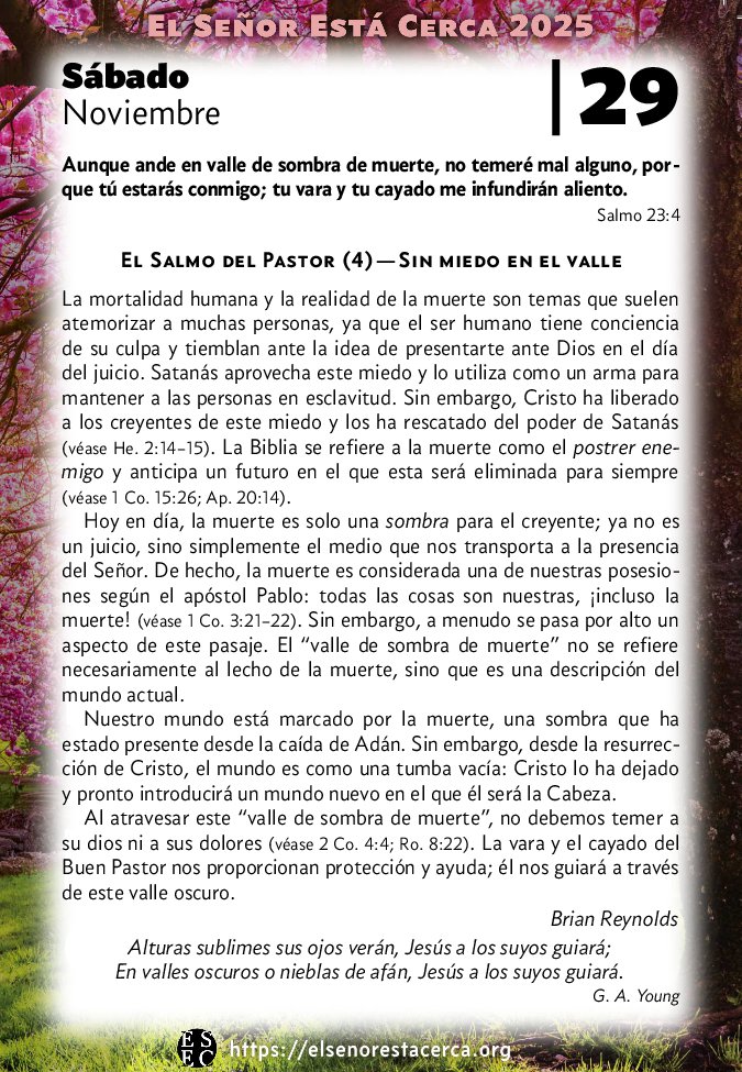 Hoy en día, la muerte es solo una sombra para el creyente; ya no es un juicio, sino simplemente el medio que nos transporta a la presencia del Señor. De hecho, la muerte es considerada una de nuestras posesiones según el apóstol Pablo: todas las cosas son nuestras, ¡incluso la muerte! (véase 1 Co. 3:21–22). Sin embargo, a menudo se pasa por alto un aspecto de este pasaje. El “valle de sombra de muerte” no se refiere necesariamente al lecho de la muerte, sino que es una descripción del mundo actual.