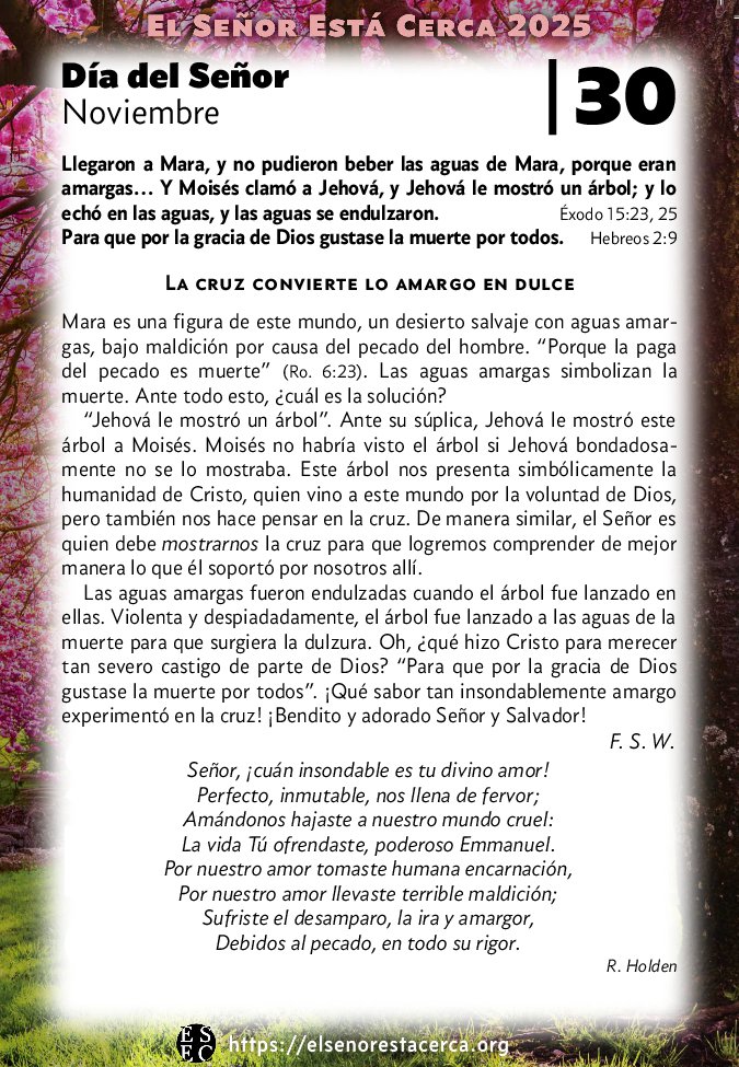 Las aguas amargas fueron endulzadas cuando el árbol fue lanzado en ellas. Violenta y despiadadamente, el árbol fue lanzado a las aguas de la muerte para que surgiera la dulzura. Oh, ¿qué hizo Cristo para merecer tan severo castigo de parte de Dios? “Para que por la gracia de Dios gustase la muerte por todos”. ¡Qué sabor tan insondablemente amargo experimentó en la cruz! ¡Bendito y adorado Señor y Salvador!