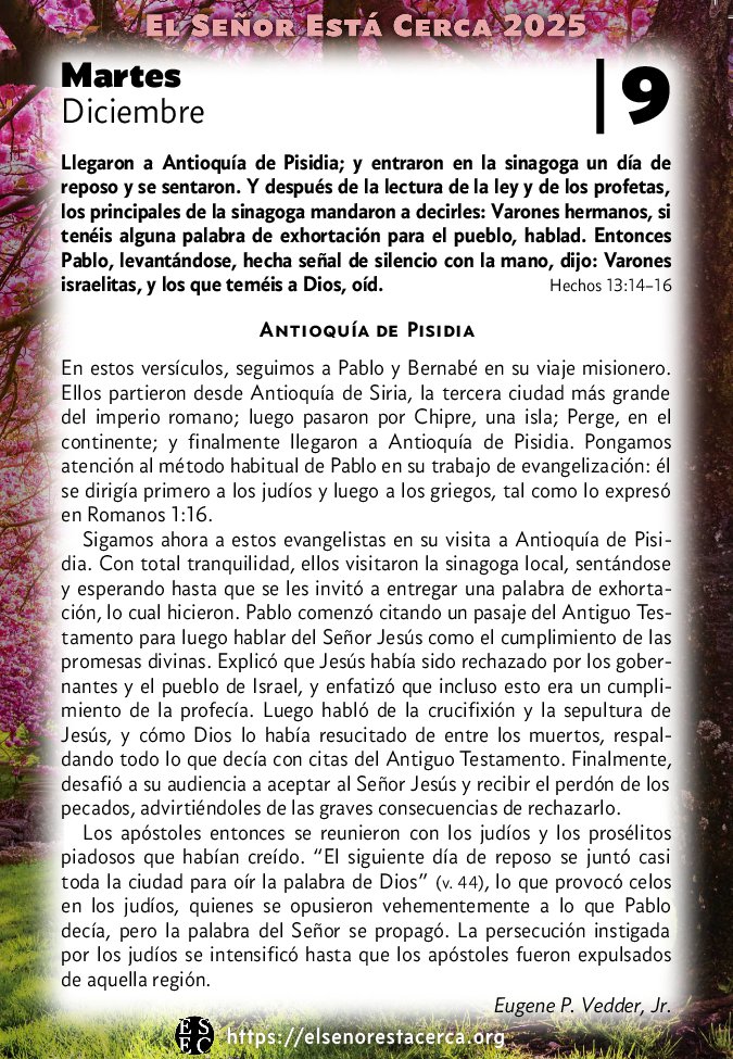 En estos versículos, seguimos a Pablo y Bernabé en su viaje misionero. Ellos partieron desde Antioquía de Siria, la tercera ciudad más grande del imperio romano; luego pasaron por Chipre, una isla; Perge, en el continente; y finalmente llegaron a Antioquía de Pisidia. Pongamos atención al método habitual de Pablo en su trabajo de evangelización: él se dirigía primero a los judíos y luego a los griegos, tal como lo expresó en Romanos 1:16.