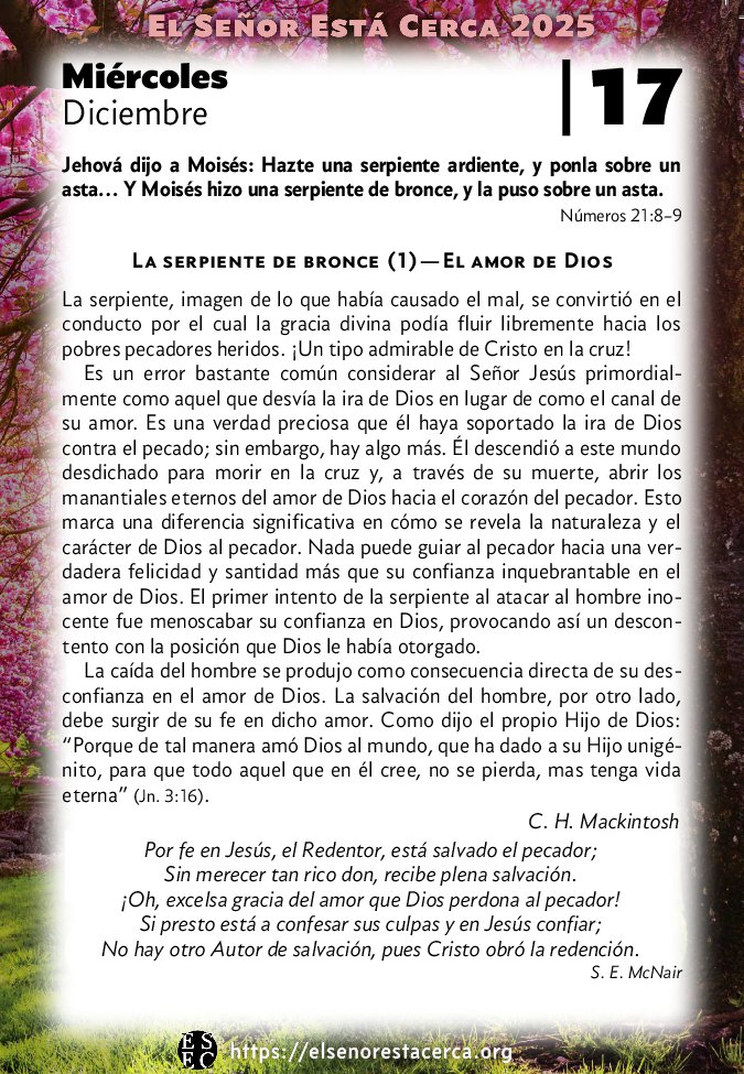 Es un error bastante común considerar al Señor Jesús primordialmente como aquel que desvía la ira de Dios en lugar de como el canal de su amor. Es una verdad preciosa que él haya soportado la ira de Dios contra el pecado; sin embargo, hay algo más. Él descendió a este mundo desdichado para morir en la cruz y, a través de su muerte, abrir los manantiales eternos del amor de Dios hacia el corazón del pecador. Esto marca una diferencia significativa en cómo se revela la naturaleza y el carácter de Dios al pecador. Nada puede guiar al pecador hacia una verdadera felicidad y santidad más que su confianza inquebrantable en el amor de Dios. El primer intento de la serpiente al atacar al hombre inocente fue menoscabar su confianza en Dios, provocando así un descontento con la posición que Dios le había otorgado.
