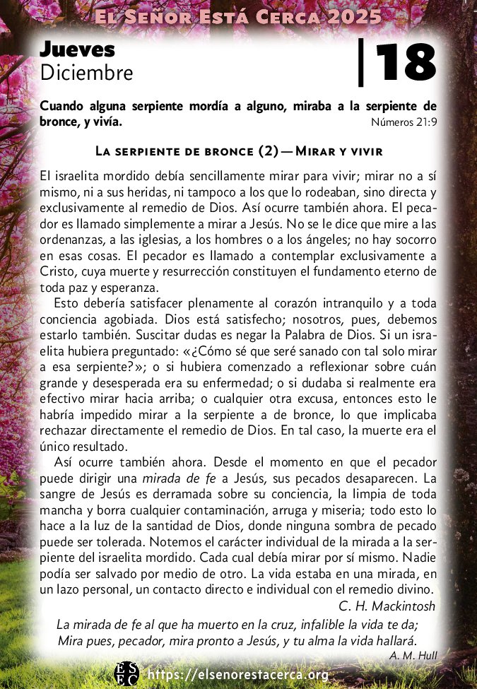 El israelita mordido debía sencillamente mirar para vivir; mirar no a sí mismo, ni a sus heridas, ni tampoco a los que lo rodeaban, sino directa y exclusivamente al remedio de Dios. Así ocurre también ahora. El pecador es llamado simplemente a mirar a Jesús. No se le dice que mire a las ordenanzas, a las iglesias, a los hombres o a los ángeles; no hay socorro en esas cosas. El pecador es llamado a contemplar exclusivamente a Cristo, cuya muerte y resurrección constituyen el fundamento eterno de toda paz y esperanza.