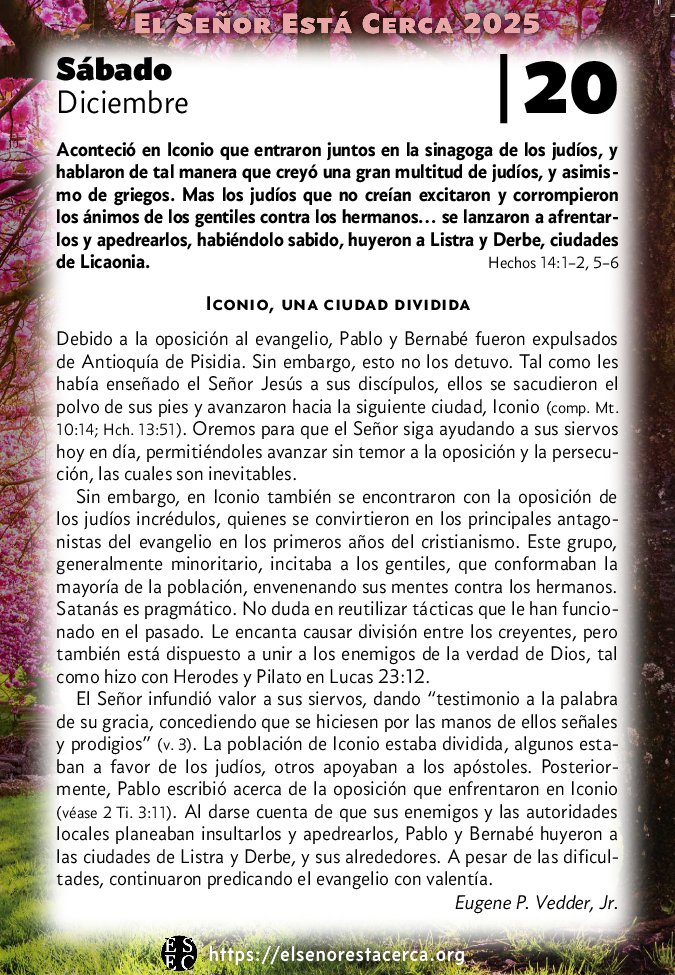 Debido a la oposición al evangelio, Pablo y Bernabé fueron expulsados de Antioquía de Pisidia. Sin embargo, esto no los detuvo. Tal como les había enseñado el Señor Jesús a sus discípulos, ellos se sacudieron el polvo de sus pies y avanzaron hacia la siguiente ciudad, Iconio (comp. Mt. 10:14; Hch. 13:51). Oremos para que el Señor siga ayudando a sus siervos hoy en día, permitiéndoles avanzar sin temor a la oposición y la persecución, las cuales son inevitables.