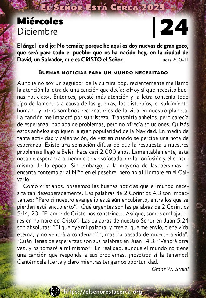 Aunque no soy un seguidor de la cultura pop, recientemente me llamó la atención la letra de una canción que decía: «Hoy sí que necesito buenas noticias». Entonces, presté más atención y la letra contenía todo tipo de lamentos a causa de las guerras, los disturbios, el sufrimiento humano y otros sombríos recordatorios de la vida en nuestro planeta. La canción me impactó por su tristeza. Transmitía anhelos, pero carecía de esperanza; hablaba de problemas, pero no ofrecía soluciones. Quizás estos anhelos expliquen la gran popularidad de la Navidad. En medio de tanta actividad y celebración, de vez en cuando se percibe una nota de esperanza. Existe una sensación difusa de que la respuesta a nuestros problemas llegó a Belén hace casi 2.000 años. Lamentablemente, esta nota de esperanza a menudo se ve sofocada por la confusión y el consumismo de la época. Sin embargo, a la mayoría de las personas le encanta contemplar al Niño en el pesebre, pero no al Hombre en el Calvario.