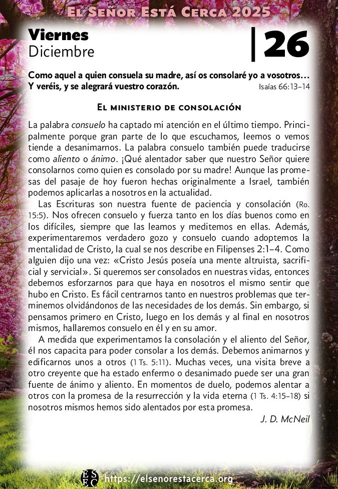 La palabra consuelo ha captado mi atención en el último tiempo. Principalmente porque gran parte de lo que escuchamos, leemos o vemos tiende a desanimarnos. La palabra consuelo también puede traducirse como aliento o ánimo. ¡Qué alentador saber que nuestro Señor quiere consolarnos como quien es consolado por su madre! Aunque las promesas del pasaje de hoy fueron hechas originalmente a Israel, también podemos aplicarlas a nosotros en la actualidad.