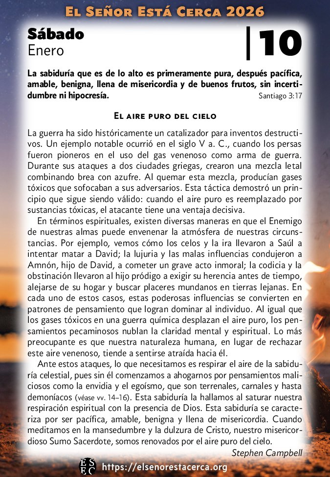 Ante estos ataques, lo que necesitamos es respirar el aire de la sabiduría celestial, pues sin él comenzamos a ahogarnos por pensamientos maliciosos como la envidia y el egoísmo, que son terrenales, carnales y hasta demoníacos (véase vv. 14–16). Esta sabiduría la hallamos al saturar nuestra respiración espiritual con la presencia de Dios. Esta sabiduría se caracteriza por ser pacífica, amable, benigna y llena de misericordia. Cuando meditamos en la mansedumbre y la dulzura de Cristo, nuestro misericordioso Sumo Sacerdote, somos renovados por el aire puro del cielo.