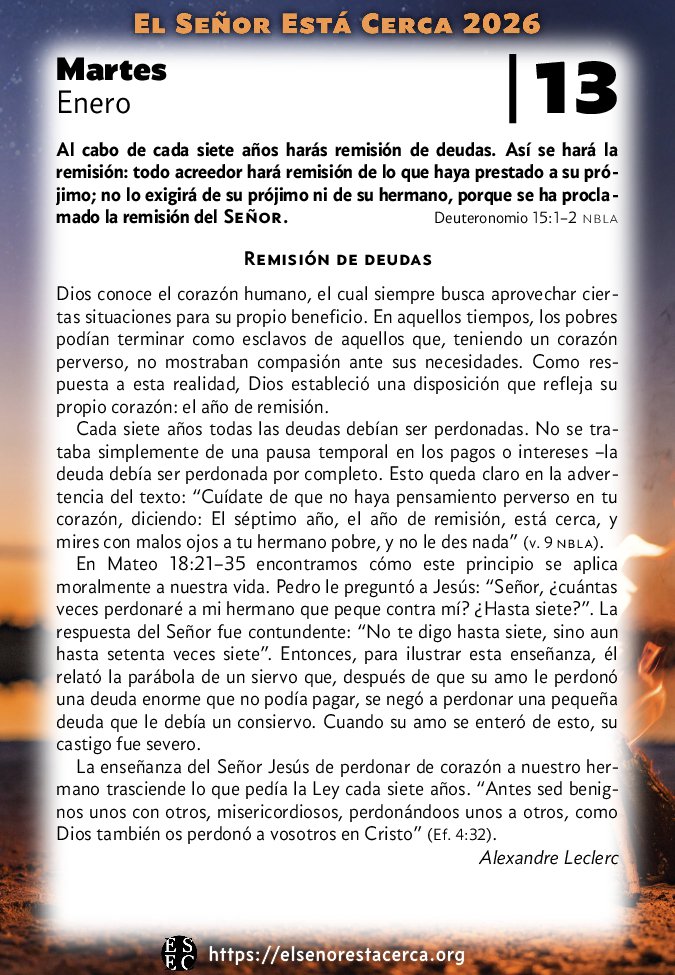 La enseñanza del Señor Jesús de perdonar de corazón a nuestro hermano trasciende lo que pedía la Ley cada siete años. “Antes sed benignos unos con otros, misericordiosos, perdonándoos unos a otros, como Dios también os perdonó a vosotros en Cristo” (Ef. 4:32).