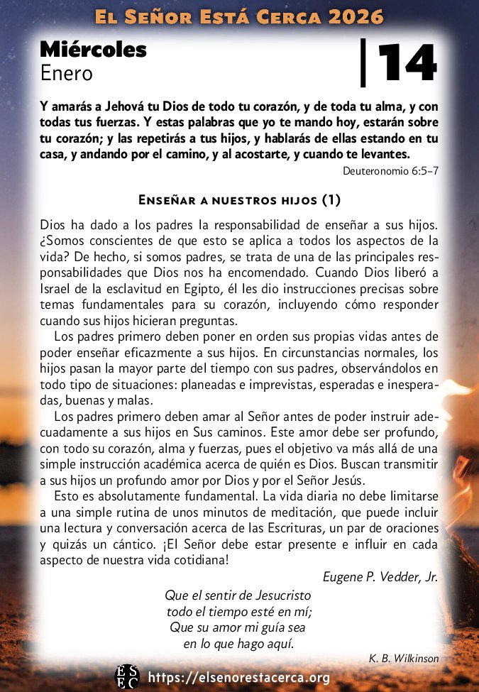 Y amarás a Jehová tu Dios de todo tu corazón, y de toda tu alma, y con todas tus fuerzas. Y estas palabras que yo te mando hoy, estarán sobre tu corazón; y las repetirás a tus hijos, y hablarás de ellas estando en tu casa, y andando por el camino, y al acostarte, y cuando te levantes. Deuteronomio 6:5–7