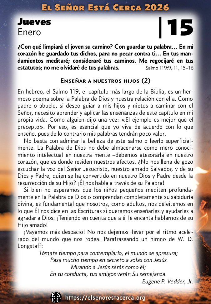 En hebreo, el Salmo 119, el capítulo más largo de la Biblia, es un hermoso poema sobre la Palabra de Dios y nuestra relación con ella. Como padre o abuelo, si deseo guiar a mis hijos y nietos a caminar con el Señor, necesito aprender y aplicar las enseñanzas de este capítulo en mi propia vida. Como alguien dijo una vez: «El ejemplo es mejor que el precepto». Por eso, es esencial que yo viva de acuerdo con lo que enseño, pues de lo contrario mis palabras tendrán poco valor.