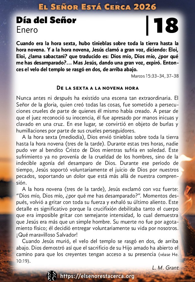 A la hora novena (tres de la tarde), Jesús exclamó con voz fuerte: “Dios mío, Dios mío, ¿por qué me has desamparado?”. Momentos después, volvió a gritar con toda su fuerza y exhaló su último aliento. Este detalle es significativo porque la crucifixión debilitaba tanto el cuerpo que era imposible gritar con semejante intensidad, lo cual demuestra que Jesús era más que un simple hombre. Su muerte no fue por agotamiento físico; él decidió entregar voluntariamente su vida por nosotros. ¡Qué maravilloso Salvador!