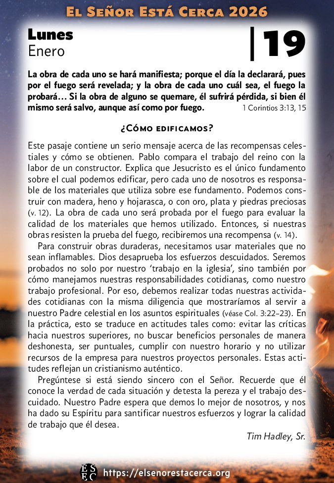 Para construir obras duraderas, necesitamos usar materiales que no sean inflamables. Dios desaprueba los esfuerzos descuidados. Seremos probados no solo por nuestro ‘trabajo en la iglesia’, sino también por cómo manejamos nuestras responsabilidades cotidianas, como nuestro trabajo profesional. Por eso, debemos realizar todas nuestras actividades cotidianas con la misma diligencia que mostraríamos al servir a nuestro Padre celestial en los asuntos espirituales (véase Col. 3:22–23). En la práctica, esto se traduce en actitudes tales como: evitar las críticas hacia nuestros superiores, no buscar beneficios personales de manera deshonesta, ser puntuales, cumplir con nuestro horario y no utilizar recursos de la empresa para nuestros proyectos personales. Estas actitudes reflejan un cristianismo auténtico.