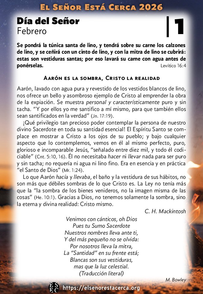 Lo que Aarón hacía y llevaba, el baño y la vestidura de sus hábitos, no son más que débiles sombras de lo que Cristo es. La Ley no tenía más que la “la sombra de los bienes venideros, no la imagen misma de las cosas” (He. 10:1). Gracias a Dios, no tenemos solamente la sombra, sino la eterna y divina realidad: Cristo mismo.