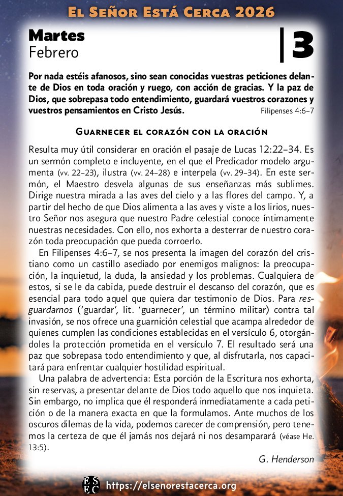 En Filipenses 4:6–7, se nos presenta la imagen del corazón del cristiano como un castillo asediado por enemigos malignos: la preocupación, la inquietud, la duda, la ansiedad y los problemas. Cualquiera de estos, si se le da cabida, puede destruir el descanso del corazón, que es esencial para todo aquel que quiera dar testimonio de Dios. Para resguardarnos (‘guardar’, lit. ‘guarnecer’, un término militar) contra tal invasión, se nos ofrece una guarnición celestial que acampa alrededor de quienes cumplen las condiciones establecidas en el versículo 6, otorgándoles la protección prometida en el versículo 7. El resultado será una paz que sobrepasa todo entendimiento y que, al disfrutarla, nos capacitará para enfrentar cualquier hostilidad espiritual.