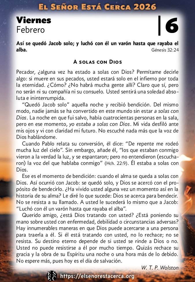 Ese es el momento de bendición: cuando el alma se queda a solas con Dios. Así ocurrió con Jacob: se quedó solo, y Dios se acercó con el propósito de bendecirlo. ¿Ha vivido usted alguna vez un momento así en la historia de su alma? Le diré lo que sucede: Dios se acerca para bendecir. No se resista a su llamado. A usted le sucederá lo mismo que a Jacob: “Luchó con él un varón hasta que rayaba el alba”.