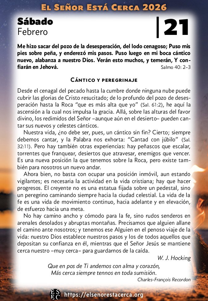 No hay camino ancho y cómodo para la fe, sino rudos senderos en arenales desolados y abruptas montañas. Precisamos que alguien allane el camino ante nosotros; y tenemos ese Alguien en el penoso viaje de la vida: nuestro Dios establece nuestros pasos y los de todos aquellos que depositan su confianza en él, mientras que el Señor Jesús se mantiene cerca nuestro –muy cerca– para guardarnos de la caída.