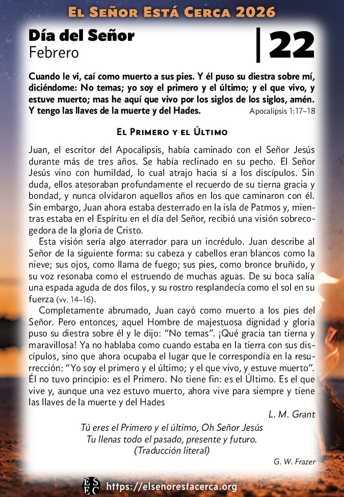 Completamente abrumado, Juan cayó como muerto a los pies del Señor. Pero entonces, aquel Hombre de majestuosa dignidad y gloria puso su diestra sobre él y le dijo: “No temas”. ¡Qué gracia tan tierna y maravillosa! Ya no hablaba como cuando estaba en la tierra con sus discípulos, sino que ahora ocupaba el lugar que le correspondía en la resurrección: “Yo soy el primero y el último; y el que vivo, y estuve muerto”. Él no tuvo principio: es el Primero. No tiene fin: es el Último. Es el que vive y, aunque una vez estuvo muerto, ahora vive para siempre y tiene las llaves de la muerte y del Hades