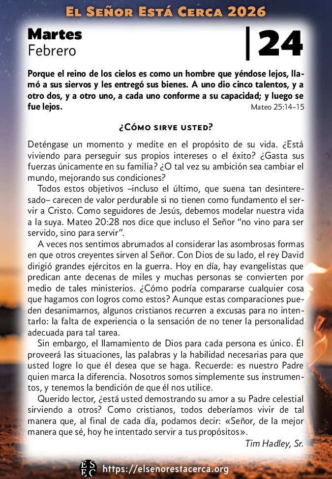 Querido lector, ¿está usted demostrando su amor a su Padre celestial sirviendo a otros? Como cristianos, todos deberíamos vivir de tal manera que, al final de cada día, podamos decir: «Señor, de la mejor manera que sé, hoy he intentado servir a tus propósitos».