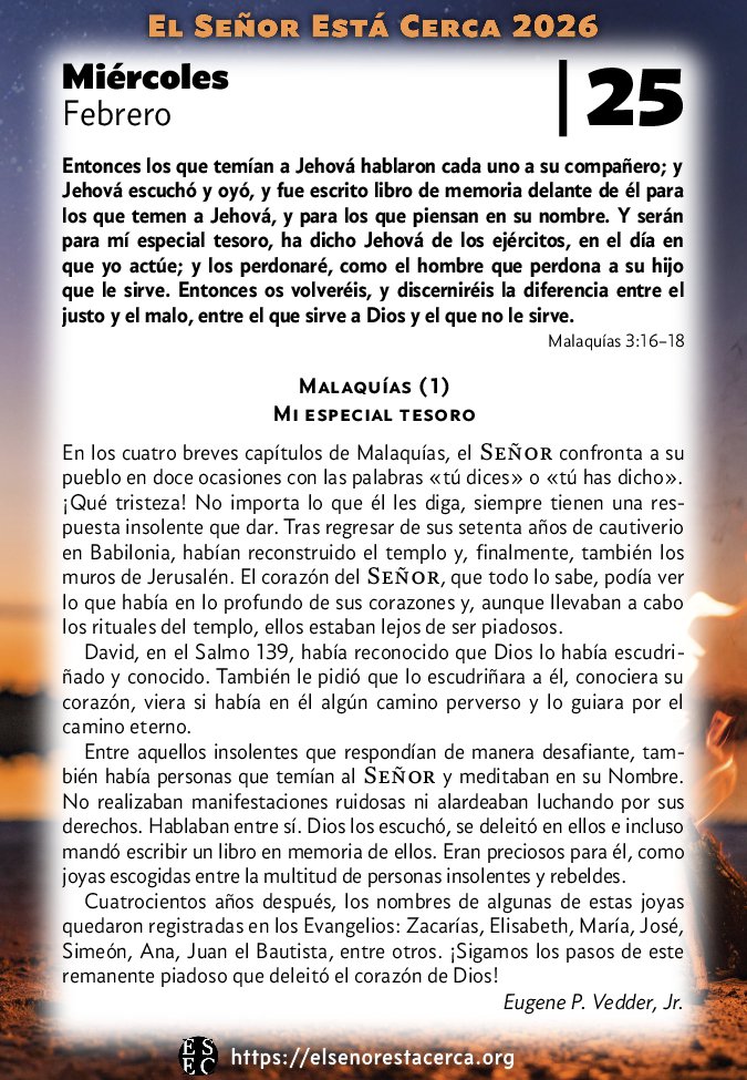 Entonces los que temían a Jehová hablaron cada uno a su compañero; y Jehová escuchó y oyó, y fue escrito libro de memoria delante de él para los que temen a Jehová, y para los que piensan en su nombre. Y serán para mí especial tesoro, ha dicho Jehová de los ejércitos, en el día en que yo actúe; y los perdonaré, como el hombre que perdona a su hijo que le sirve. Entonces os volveréis, y discerniréis la diferencia entre el justo y el malo, entre el que sirve a Dios y el que no le sirve. Malaquías 3:16–18