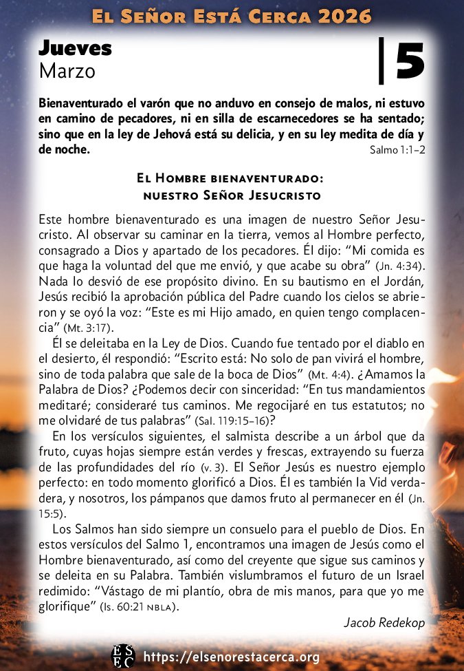Este hombre bienaventurado es una imagen de nuestro Señor Jesucristo. Al observar su caminar en la tierra, vemos al Hombre perfecto, consagrado a Dios y apartado de los pecadores. Él dijo: “Mi comida es que haga la voluntad del que me envió, y que acabe su obra” (Jn. 4:34). Nada lo desvió de ese propósito divino. En su bautismo en el Jordán, Jesús recibió la aprobación pública del Padre cuando los cielos se abrieron y se oyó la voz: “Este es mi Hijo amado, en quien tengo complacencia” (Mt. 3:17).