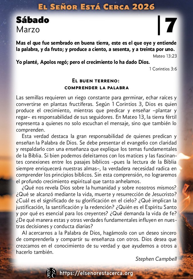 Las semillas requieren un riego constante para germinar, echar raíces y convertirse en plantas fructíferas. Según 1 Corintios 3, Dios es quien produce el crecimiento, mientras que predicar y enseñar –plantar y regar– es responsabilidad de sus seguidores. En Mateo 13, la tierra fértil representa a quienes no solo escuchan el mensaje, sino que también lo comprenden.