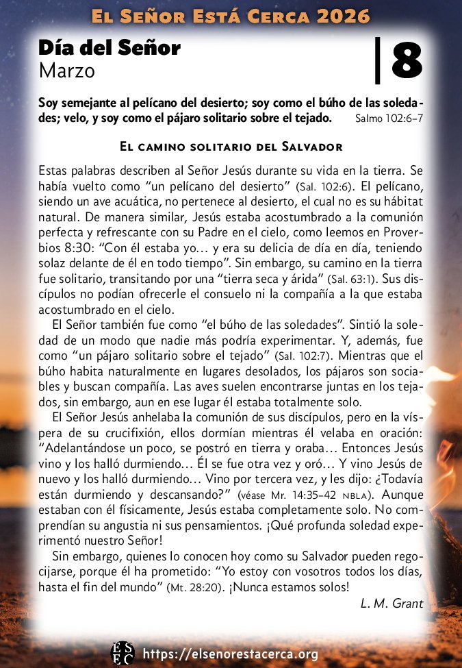 Sin embargo, quienes lo conocen hoy como su Salvador pueden regocijarse, porque él ha prometido: “Yo estoy con vosotros todos los días, hasta el fin del mundo” (Mt. 28:20). ¡Nunca estamos solos!