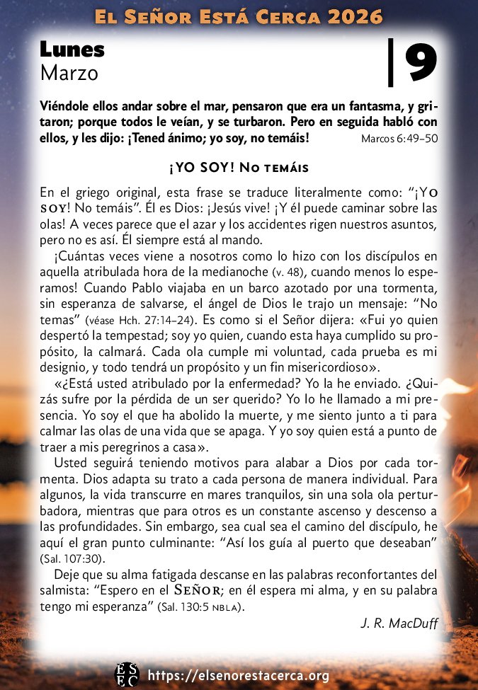 Viéndole ellos andar sobre el mar, pensaron que era un fantasma, y gritaron; porque todos le veían, y se turbaron. Pero en seguida habló con ellos, y les dijo: ¡Tened ánimo; yo soy, no temáis! Marcos 6:49–50
